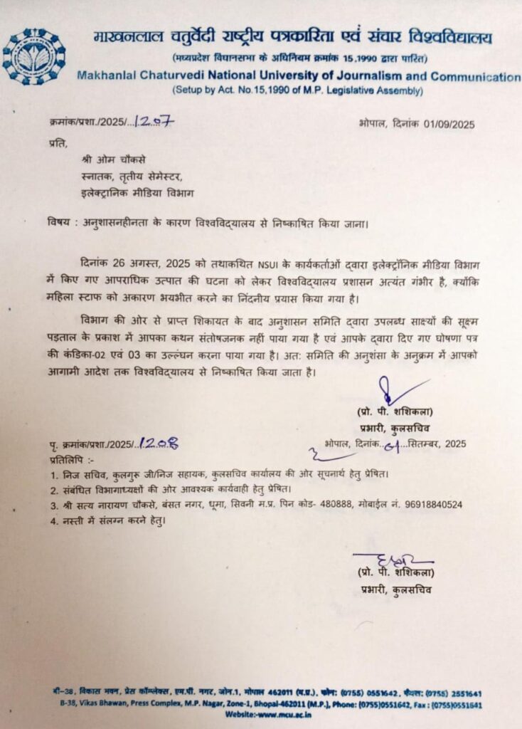 रिपोर्ट, काजल जाटव: भोपाल स्थित माखनलाल चतुर्वेदी राष्ट्रीय पत्रकारिता एवं संचार विश्वविद्यालय (MCU) ने हाल ही में एक बड़ा कदम उठाते हुए तीसरे सेमेस्टर के छात्र श्री ओम चौकसे को विश्वविद्यालय से बाहर कर दिया है। ये निर्णय हाल ही में 26 अगस्त 2025 को इलेक्ट्रॉनिक मीडिया विभाग में हुई शिकायत के बाद लिया गया, जिसमें कहा गया कि NSUI के कुछ कार्यकर्ता शामिल थे।