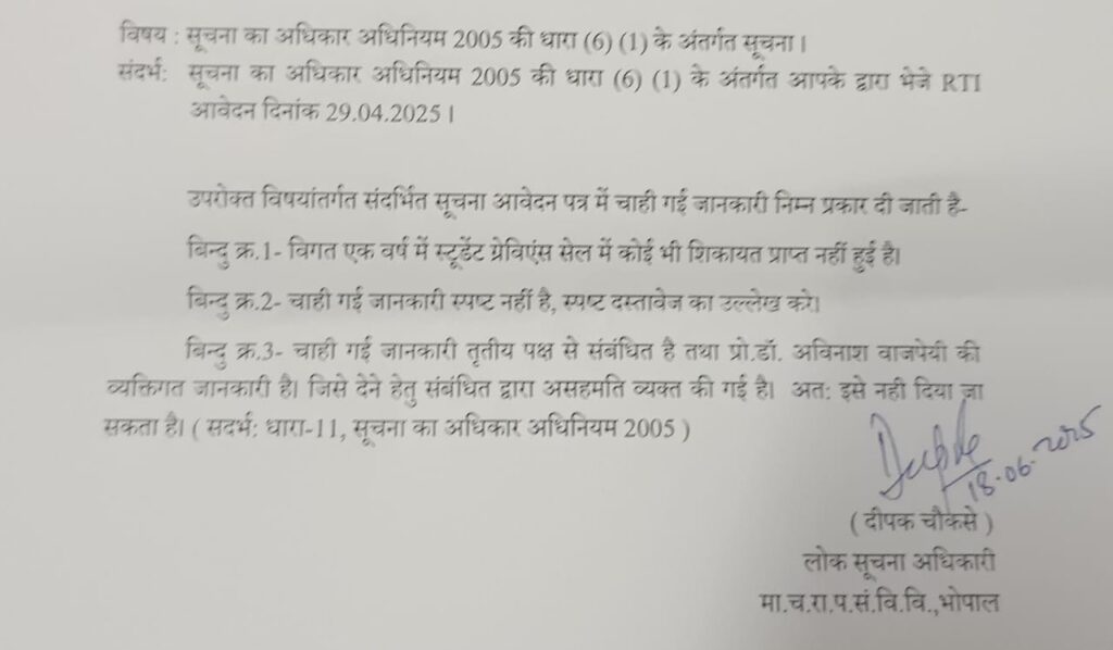 18 जून 2025 को प्राप्त विश्वविद्यालय के उत्तर में कहा गया कि पिछले एक वर्ष में कोई शिकायत दर्ज नहीं हुई है। कर्मचारियों की संख्या की जानकारी स्पष्ट नहीं दी गई। सबसे बड़ी बात यह रही कि कुलसचिव की डिग्री और पीएचडी से जुड़ी जानकारी को तीसरे पक्ष की ‘व्यक्तिगत जानकारी’ मानते हुए देने से इनकार कर दिया गया। साथ ही यह बताया गया कि संबंधित अधिकारी ने यह जानकारी सार्वजनिक करने की अनुमति नहीं दी है।