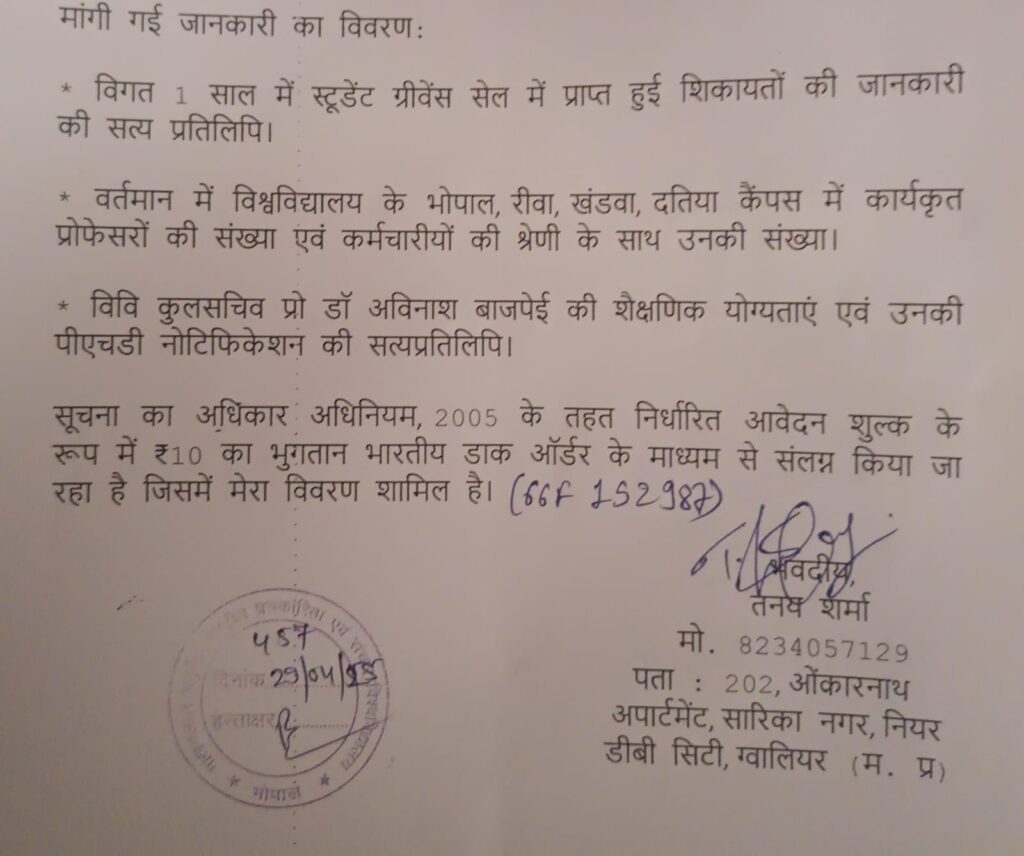 इसी आवेदन में विश्वविद्यालय के भोपाल, रीवा, खंडवा और दतिया परिसरों में कार्यरत शिक्षकों और कर्मचारियों की संख्या तथा पिछले एक वर्ष में छात्र शिकायत प्रकोष्ठ में दर्ज की गई शिकायतों की जानकारी भी माँगी गई थी।