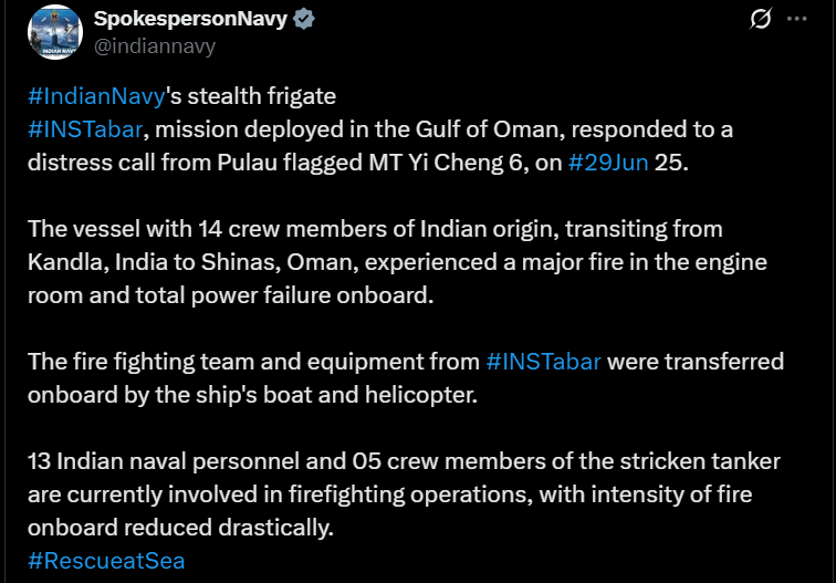 On June 29-2025, the episode began when it was that the Indian Navy’s Maritime Rescue Coordination Centre (MRCC) received a distress call from a merchant vessel that was located over 200 nautical miles off of the Indian coast. The vessel, with a multinational crew on board its deck, had encountered a severe mechanical failure, so it was adrift within rough waters. The monsoon strengthened; also, intervention was required immediately. The possibility of the ship capsizing increased as conditions worsened. A Pulau-flagged oil tanker, MT Yi Cheng 6, carrying 14 crew members, caught a major fire in the engine room and total power failure onboard.