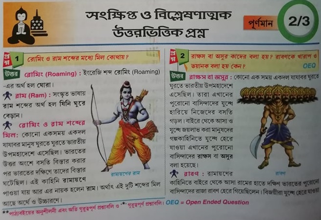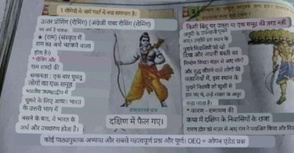 छात्रों से पूछा गया है, “राम और रोमिंग शब्दों में क्या समानता है?” उत्तर में लिखा गया है: “रोमिंग एक अंग्रेज़ी शब्द है। राम शब्द से रोमिंग शब्द की उत्पत्ति हुई है। राम दरअसल एक विदेशी आक्रांता थे, जो भारत में आकर बस गए। और दूसरी तरफ़ रावण को देवता का स्वरूप बताया।