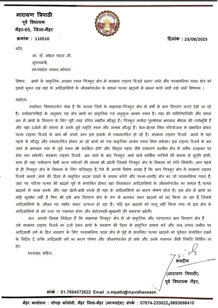 रिशाली त्रिपाठी गोस्वामी: मध्यप्रदेश के मैहर-65 क्षेत्र से पूर्व विधायक नारायण त्रिपाठी ने मुख्यमंत्री डॉ. मोहन यादव को पत्र लिखकर मझगवा-चित्रकूट क्षेत्र में सरसंग्राम टाइगर रिजर्व बनाने और इस इलाके में संचालित हो रही पत्थर खदानों पर रोक लगाने की मांग की है।